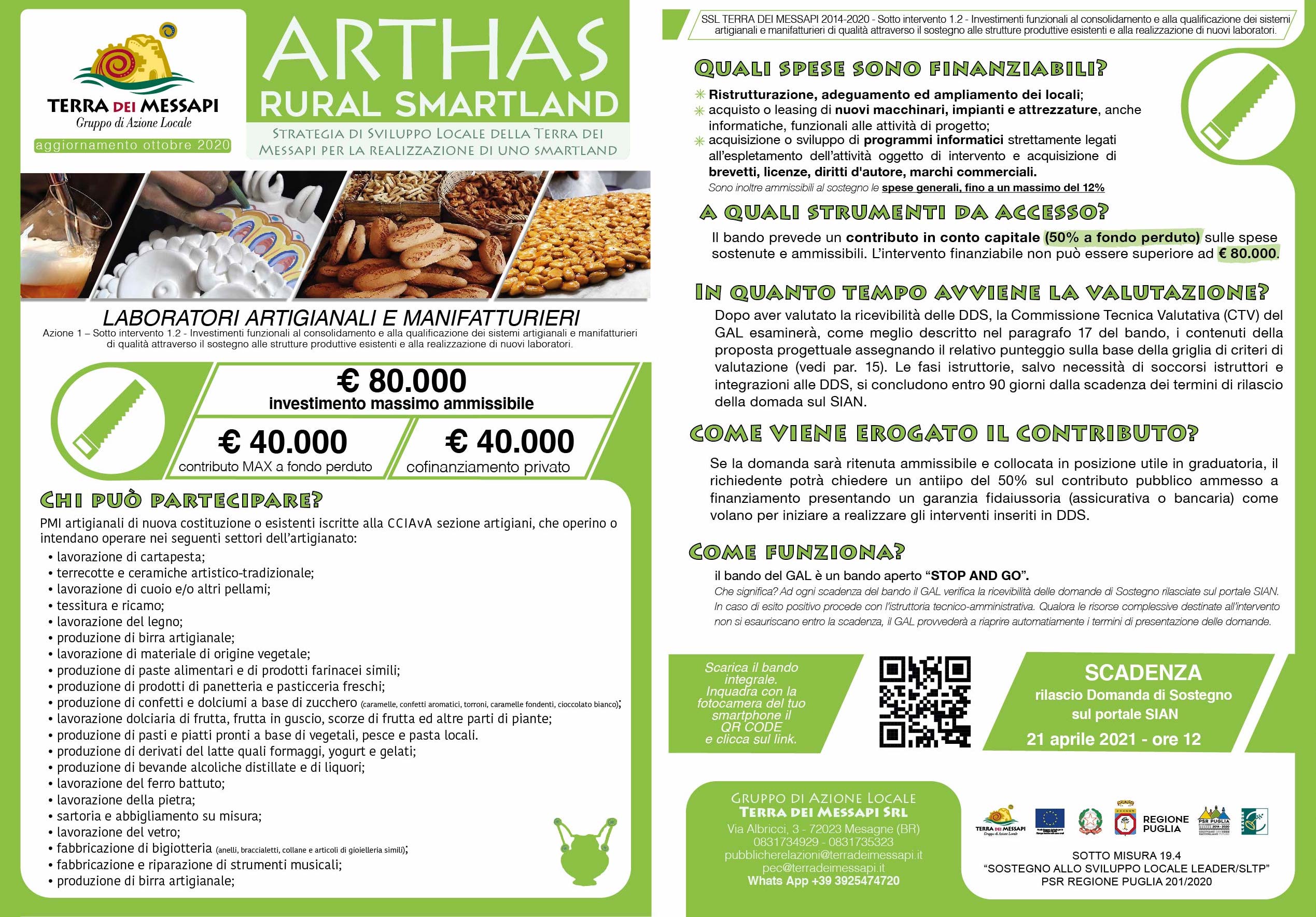 Pubblicato sul BURP n. 116 del 13-08-2020 la nuova versione dell’avviso 1.2 che si prefigge di sostenere la creazione e/o lo sviluppo di PMI artigianali tipiche e artistiche, che operano o intendano operare nei settori previsti nel paragrafo “beneficiari” del bando.