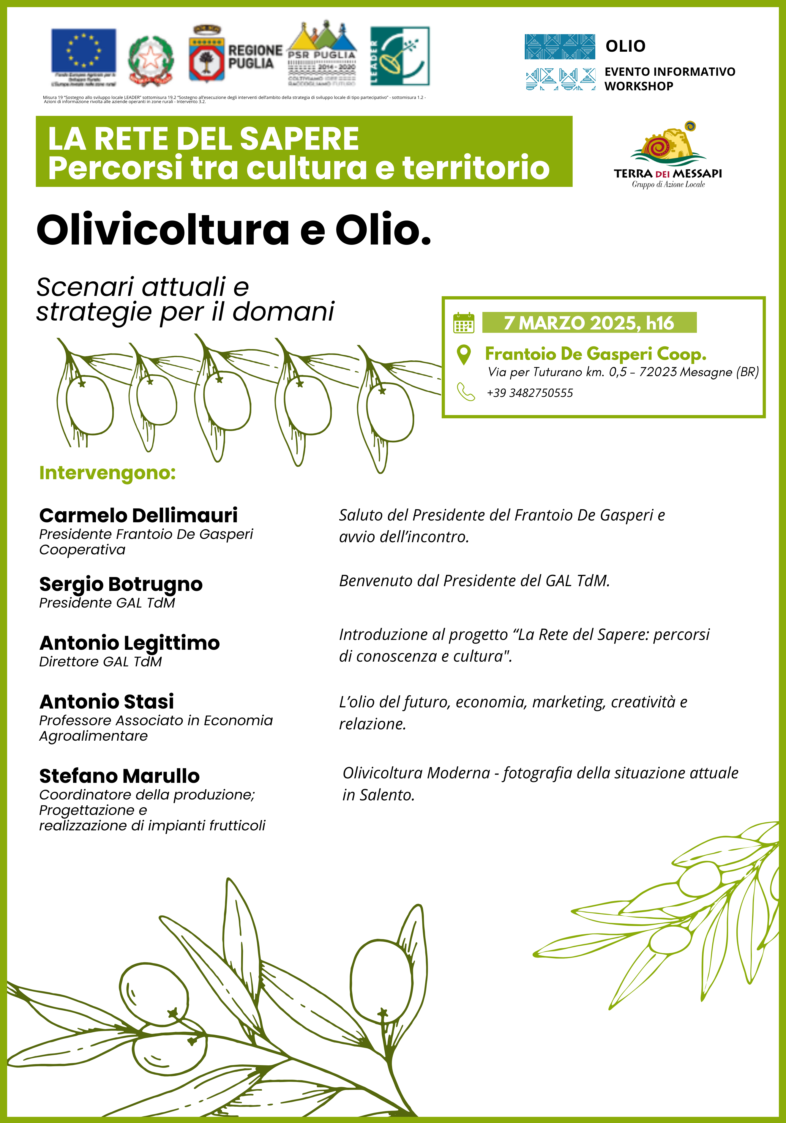 Il 7 marzo alle 16h Ti invitiamo a partecipare all’evento “Olivicoltura e Olio: Scenari Attuali e Strategie per il Domani”, un’occasione per approfondire il presente e il futuro del settore con due interventi di grande valore: