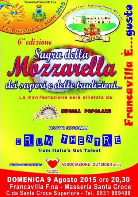 Il 9 luglio a partire dalle 20.30 la Masseria Santacroce è lieta di invitare tutti alla VI edizione della Sagra della Mozzarella dei Sapori e delle Tradizioni. L’Evento è Patrocinato del Comune di Francavilla Fontana, Assessorato Sport e Turismo. Una Festa popolare in cui sarà possibile degustare i vari prodotti lattiero caseari che l’azienda per l’occasione produrrà al momento. Inoltre parteciperanno altre aziende locali con i propri prodotti tipici pugliesi. La serata sarà allietata dal gruppo di musica popolare “Jazzabanna” con Piero Balsamo. Ospiti speciali della serata, direttamente dal programma Italian’s Got Talent, i Drum Theatre. La serata è a scopo benefico a favore dell’Associazione Outsider Onlus.